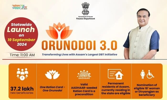 On October 7, the Assam government launched Orunodoi 3.0, expanding its flagship women-centric financial aid scheme to over 38 lakh families. Chief Minister Himanta Biswa Sarma called it Assam’s largest anti-poverty initiative, providing ₹1,250 per month to each beneficiary, including an additional ₹250 subsidy for LPG cylinders. Sarma highlighted the scheme’s role in helping thousands of households overcome poverty and promoting dignity, while promising a special surprise for beneficiaries in February. Alongside Orunodoi, the state continues to provide free rice, subsidised pulses and LPG, free education, girl child incentives, and healthcare under various welfare programs.